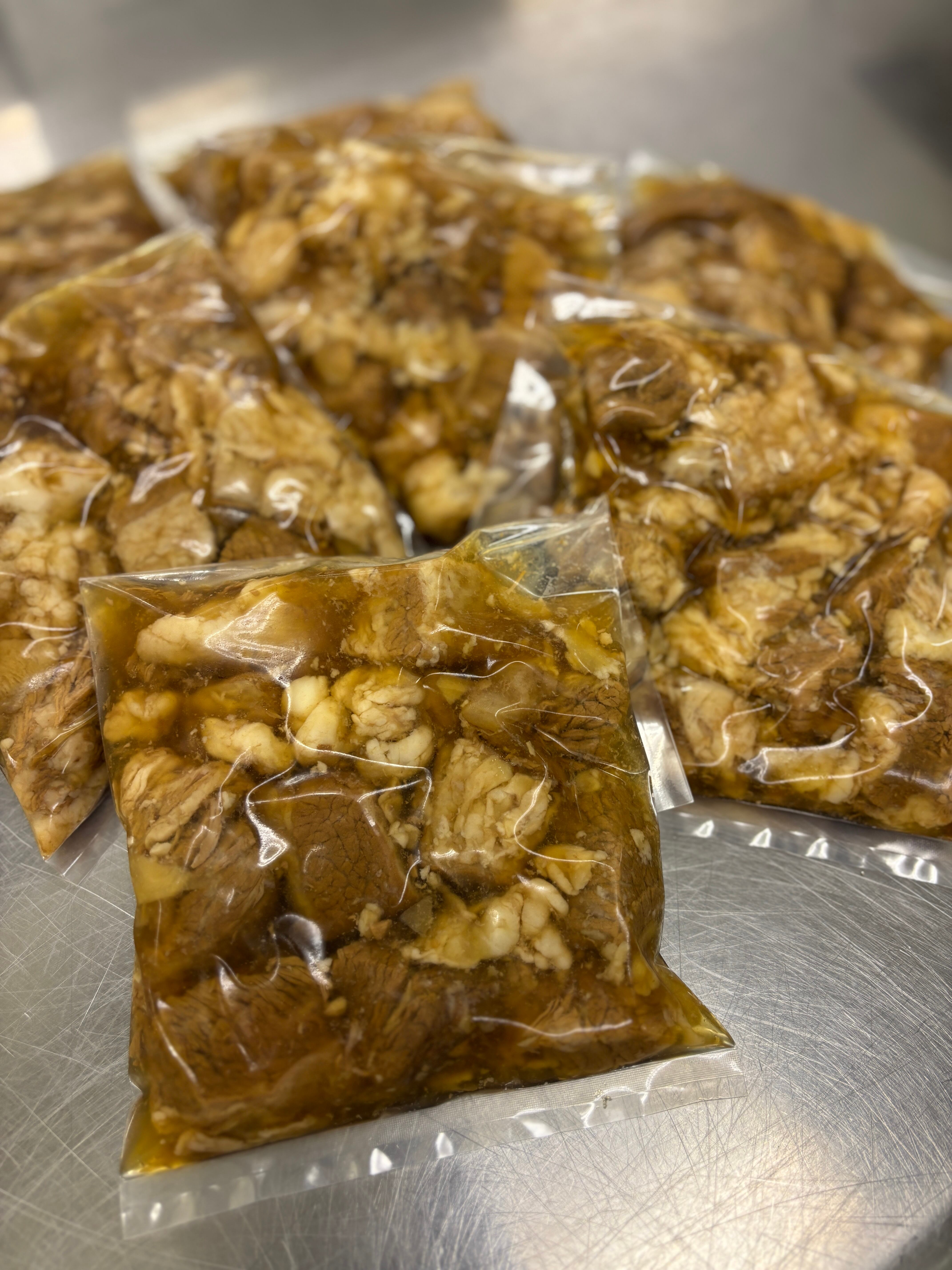 (株)渡邉肉牛牧場で愛情を込め大切に育てた牛の牛肉は、赤身の旨味が強く脂身はあっさりとした味が特徴です。この牛肉のバラ肉を使用して、牛角煮を作りました。